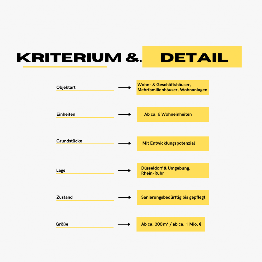 Hier sehen Sie auf einen Blick, welche Objekte wir suchen. Sollten Sie unsicher sein, ob Ihre Immobilie passt: Sprechen Sie uns gerne an – wir prüfen jedes Angebot individuell.